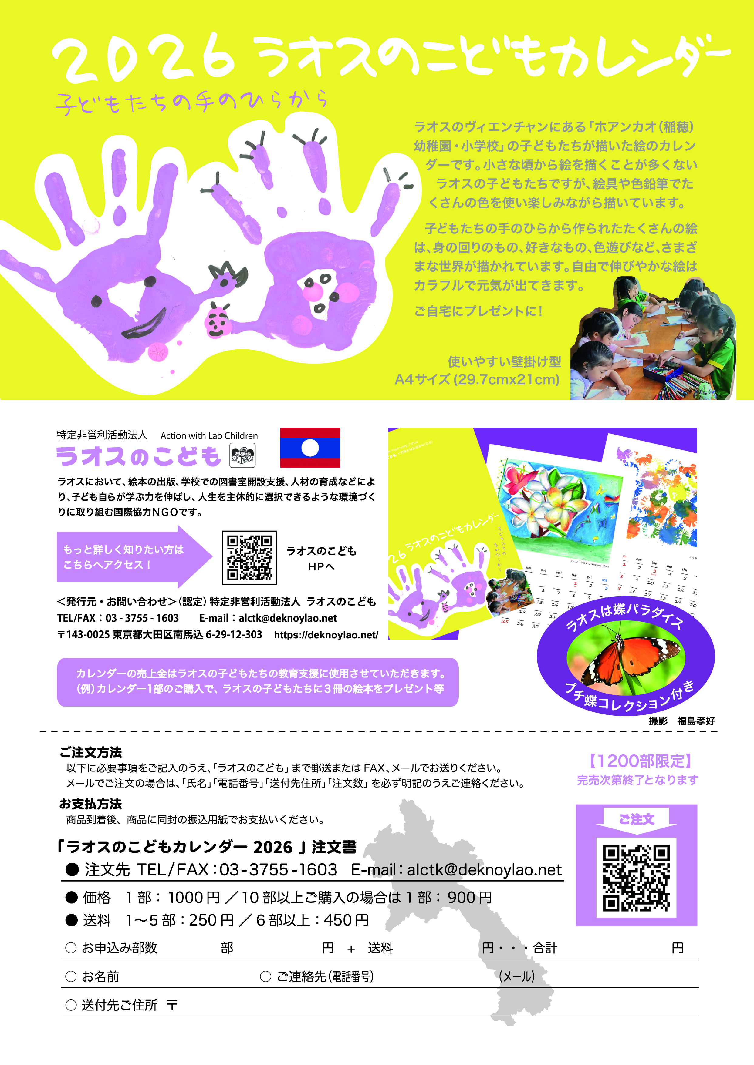 カレンダーの収益は、ラオスの子どもたちの教育支援活動に大切に使わせていただきます。例えば、カレンダー1部のご購入で、ラオスの子どもたちに絵本3冊をプレゼントすることができます。みなさまの温かいご協力をどうぞよろしくお願いします。